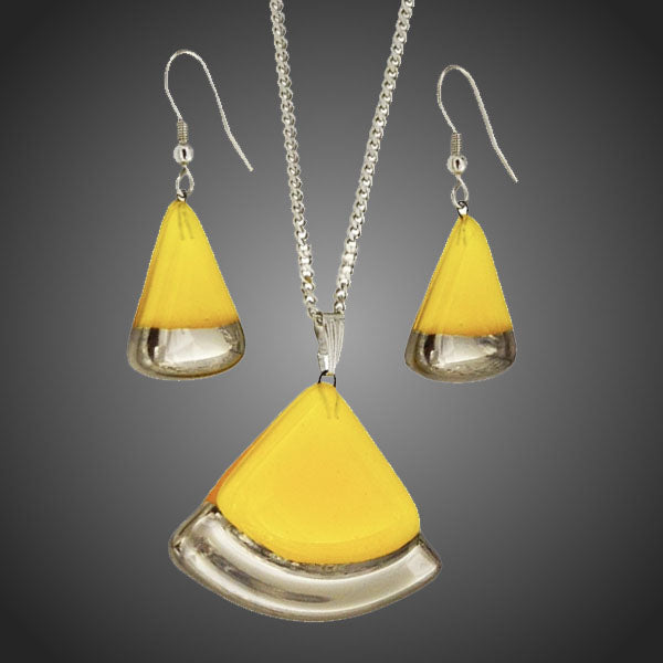 Nádherný originálny set s dizajnom maľovaného žltého odolného skla zdobeného pravou platinou Antialergické. Vhodný na bežné nosenie aj na spoločenské udalosti.