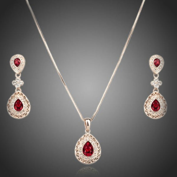 Elegantný set s ladnými líniami v kvapkach s červenými zirkónmi v spoločnosti zažiari. Z Vďaka kvalitnej galvanizácii si zachováva dlhotrvajúci lesk a jas. Bez obsahu niklu, olova, kadmia. Antialergické..