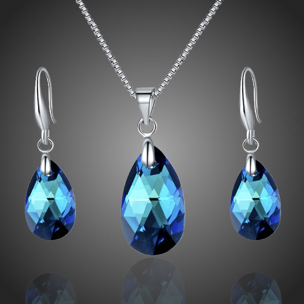 Set s elegantnými modrými krištáľmi v ladných kvapkách vyzdvihne Váš outfit. Vďaka galvanizácii platinou si zachováva dlhotrvajúci lesk a jas. Bez obsahu niklu, olova, kadmia. Antialergické.