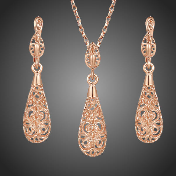 Obľúbený set s jemnými líniami kvapiek, ktoré sú zaujímavo vyrezávané. Trendy farba ružového zlata Vás poláska. Vďaka kvalitnej galvanizácii si zachováva dlhotrvajúci lesk a jas. Bez obsahu niklu, olova, kadmia. Antialergické.