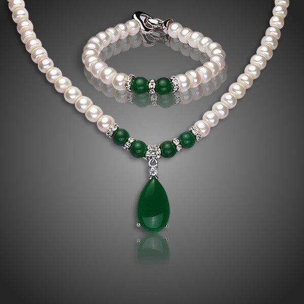 Výnimočný perlový set s bielymi riečnymi perlami v kombinácii s módnym zeleným achátom a drobnými zirkónmi z Vás spraví neprehliadnuteľnú elegantnú dámu. Zapínanie si vďaka galvanizácii trojvrstvou platiny zachováva dlhotrvajúci lesk a jas. Antialergické.