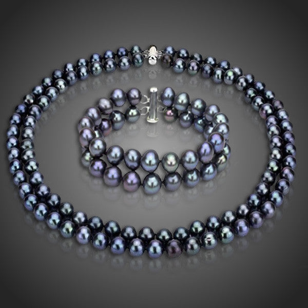 Elegantná dáma s čiernymi riečnymi perlami. Zahaľte sa do luxusu nádherných perál s odleskom tmavofialovej až čiernej. Dvojradový náhrdelník a náramok stvorený pre Vás. Zapínanie si vďaka galvanizácii trojvrstvou platiny zachováva dlhotrvajúci lesk a jas. Antialergické.