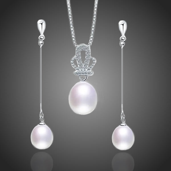 Elegantný sofistikovaný set s bielymi ovalnými riečnymi perlami zdobený drobnými zirkónmi s použitím špeciálnej techniky micropave. Vďaka galvanizácii platinou si zachováva dlhotrvajúci lesk a jas. Bez obsahu niklu, olova, kadmia. Antialergické.