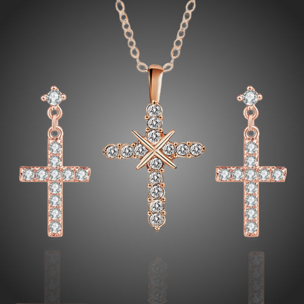 Obľúbený set s jemnou retiazkou s krížikmi, ktoré sú vykladané mnohými žiarivými drobnými čírymi krištáľmi. Trendy farba ružového zlata Vás poláska. Vďaka kvalitnej galvanizácii si zachováva dlhotrvajúci lesk a jas. Bez obsahu niklu, olova, kadmia. Antialergické.