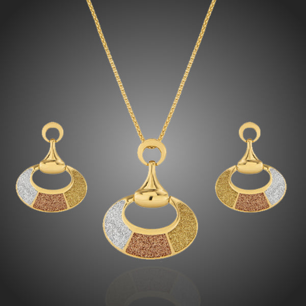 Zaujímavý dámsky set luxusnej bižutérie v elegantnom prevedení vypieskovaný trofa farbami - zlatou, striebornou, zlatohnedou vyzdvihne Vašu ženskosť. Z Vďaka kvalitnej galvanizácii si zachováva dlhotrvajúci lesk a jas. Bez obsahu niklu, olova, kadmia. Antialergické.