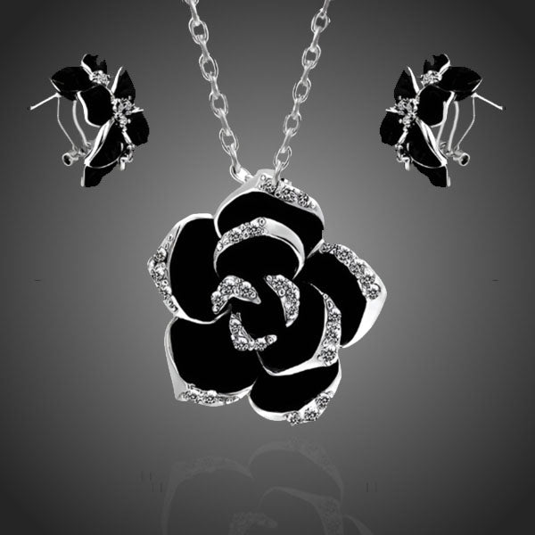 Krásny romantický set luxusnej bižutérie s čiernymi ružami, ktoré sú po okrajoch lemované žiarivými drobnými čírymi krištáľmi. Vďaka kvalitnej galvanizácii si zachováva dlhotrvajúci lesk a jas. Bez obsahu niklu, olova, kadmia. Antialergické.