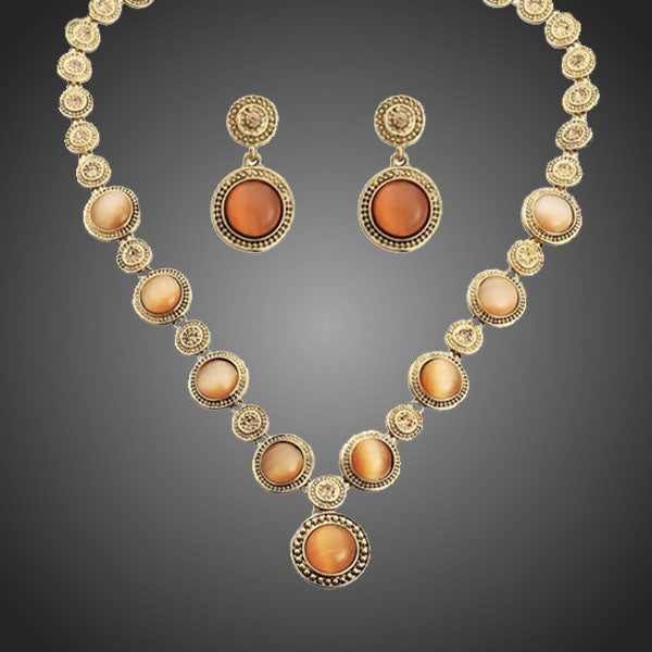 Výnimočný set s módnymi oranžovo-hnedými opálmi v žltom zlate vynikne. Šperk, ktorý nosí skutočná dáma. Vďaka kvalitnej galvanizácii si zachováva dlhotrvajúci lesk a jas. Bez obsahu niklu, olova, kadmia. Antialergické.