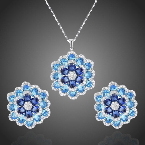 Nádherný set s ladnými kvetmi vykladanými modrými , tmavomodrými a čírymi zirkónmi zažiari. Vďaka kvalitnej galvanizácii si zachováva dlhotrvajúci lesk a jas. Bez obsahu niklu, olova, kadmia. Antialergické.