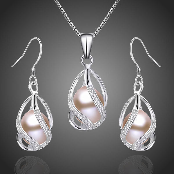 Elegantný náhrdelník a náušnice v kombinácii s ružovou riečnou perlou uloženou v točenom ladnom prívesku. Vďaka galvanizácii platinou si zachováva dlhotrvajúci lesk a jas. Bez obsahu niklu, olova, kadmia. Antialergické.