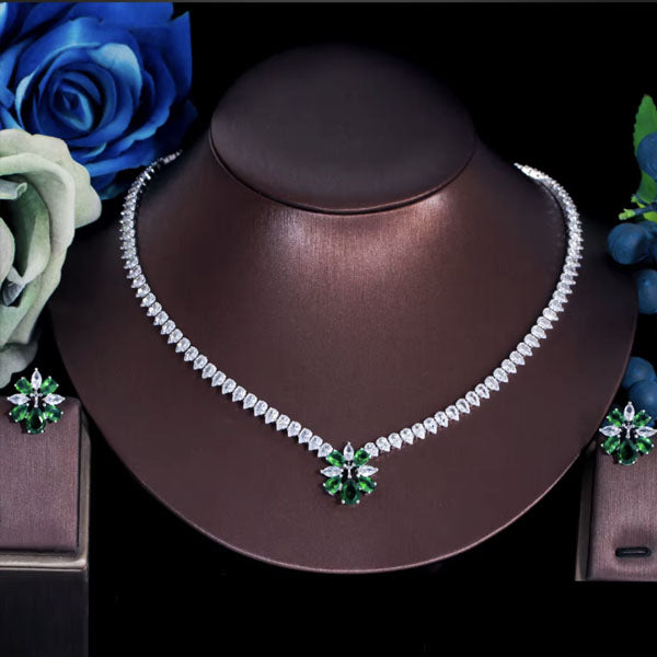 Dámsky set s originálnym dizajnom vyzdvihnutý krásnymi kvietkami s mnohými čírymi a zelenými zirkónmi podčiarkne ženskú jemnosť a krásu. Vďaka kvalitnej galvanizácii 3 vrstvou bieleho zlata si zachováva dlhotrvajúci lesk a jas. Bez obsahu niklu, olova, kadmia. Antialergické.
