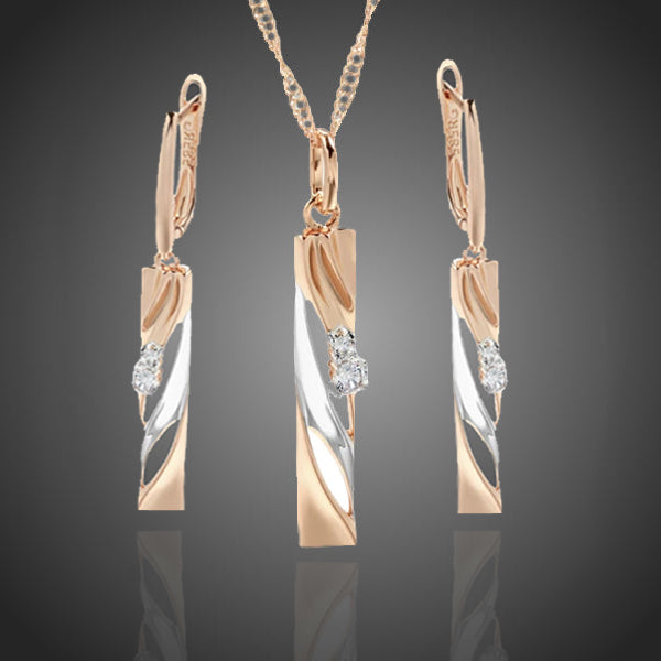 Elegantný set s decentným pozdĺžnym príveskom v ružovo-bielom zlate so žiarivým zirkónom sa stane krásnym doplnkom. Vďaka kvalitnej galvanizácii si zachováva dlhotrvajúci lesk a jas. Bez obsahu niklu, olova, kadmia. Antialergické.