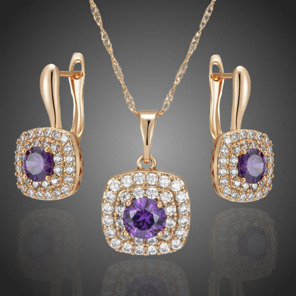 Krásny dámsky set so žiarivými fialovými zirkónmi obkolesený mnohými čírymi zirkónmi na Vás vynikne. Vďaka kvalitnej galvanizácii si zachováva dlhotrvajúci lesk a jas. Bez obsahu niklu, olova, kadmia. Antialergické.