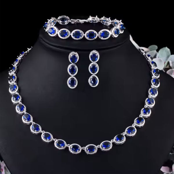 Nádherný žiarivý spoločenský set s mnohými modrými a čírymi zirkónmi s diamantovým odleskom. Vďaka galvanizácii 3 vrtstvou bieleho zlata si zachováva dlhotrvajúci lesk a jas. Bez obsahu niklu, olova, kadmia. Antialergické.