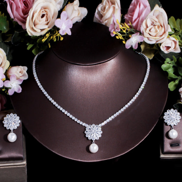 Krásny ladný set so žiarivými čírymi zirkónmi s diamantovým odleskom doplnený krištáľovými perlami v spoločnosti uchváti. Vhodný aj ako svadobný set. Jeho detaily Vás v skutočnosti nadchnú.